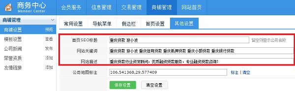 四、点击其他设置,进入网站SEO优化,依次输入网站首页SEO标题、网站关键词、网站描述等信息!